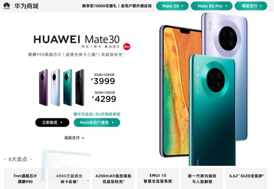 其中,华为Mate30售价3999元起,5G版则是4999元起;Mate30 Pro售价5799元起,5G版为6899元起。