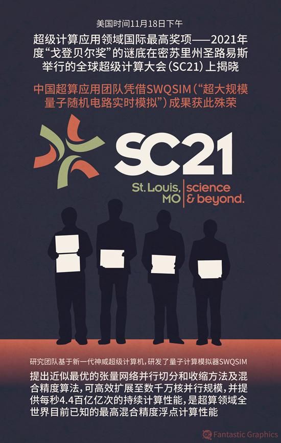 当地时间11月18日下午,超级计算应用领域国际最高奖项——2021年度“戈登·贝尔”奖的谜底在美国密苏里州圣路易斯举行的全球超级计算大会上揭晓,之江实验室牵头的中国超算应用团队,凭借新一代神威超级计算机研发的量子计算模拟器——“超大规模量子随机电路实时模拟”(SWQSIM)获此殊荣。这是继2016年、2017年、2020年之后,中国团队再次在超级计算应用领域登顶。