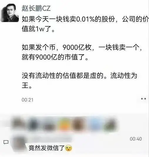 就在币圈为之震惊欢呼的时候,赵长鹏却在凌晨十二点半的朋友圈发文称:“如果今天一块钱卖0.01%的股份,公司的价值就1w了。如果发个币,9000亿枚,一块钱卖一个,就有9000亿的市值了”,表示“没有流动性的估值都是虚的。流动性为王”。