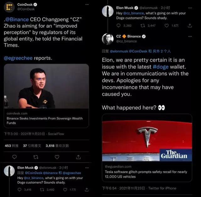 11月23日,因不满币安暂停了狗狗币的提现,马斯克推特评论并且艾特赵长鹏,质疑其“币安”对狗狗币用户做了什么?