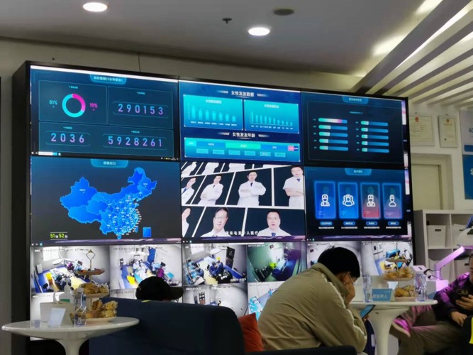 大厅的中央,一块硕大的电子屏上,正在“直播”每一台“手术”,供顾客的家人了解实况进展。大屏旁边还有一些数字,分别是各种实时数据(每五分钟更新一次):已服务人数、脱发原因、发友年龄、发友职业、脱发省份排名等等。