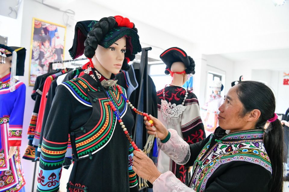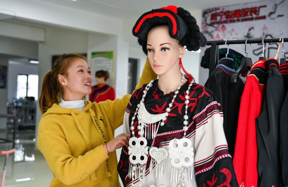 在贵州省威宁县五里岗街道朝阳新城易地扶贫搬迁安置小区,搬迁户在就业扶贫手工车间整理缝制完毕的民族服饰(11月28日摄)。新华社记者 杨文斌 摄