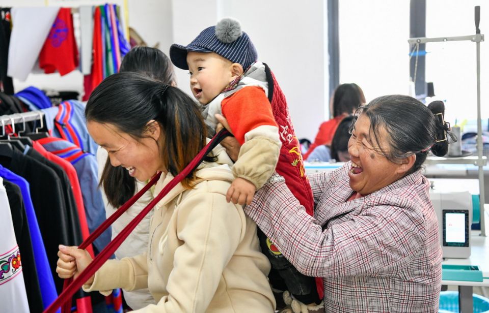 在贵州省威宁县五里岗街道朝阳新城易地扶贫搬迁安置小区,搬迁户在就业扶贫手工车间可以一边就业,一边带孩子(11月28日摄)。新华社记者 杨文斌 摄