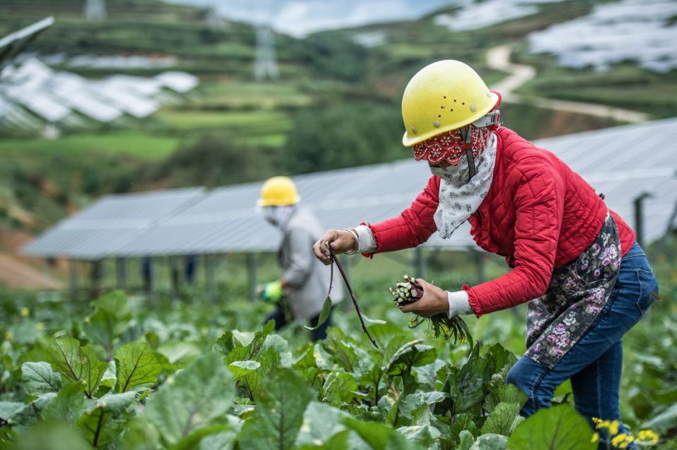 贵州省威宁县村民在仙水窝光伏电站采摘红菜苔(8月24日摄)。新华社记者 陶亮 摄