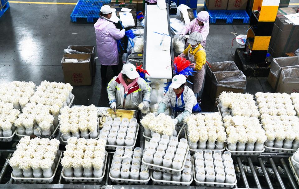 工人在位于贵州威宁经济开发区一家生物科技有限公司生产车间包装金针菇(11月28日摄)。新华社记者 杨文斌 摄
