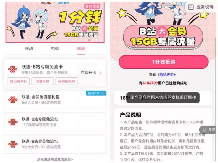 “当时为了找一部纪录片,我在手机下载了B站APP。”丁程告诉《豹变》,登陆后APP弹出了一个“1分钱领大会员和15G流量”的页面。丁程说,这个页面一直就停在手机前端,她点也点不掉。为了继续看记录片,她只有点开页面,输入手机号和验证码后,短信就通知她开通了这个业务。丁程说,看完短信她才了解到这个产品的合约期为6个月,只有首月为1分钱,次月起25元/月。