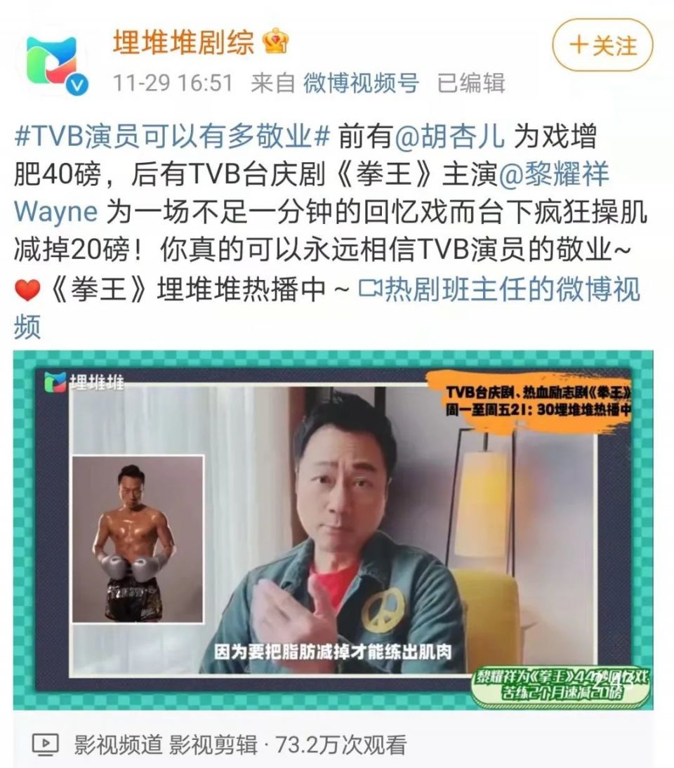 在该条热搜下面,为了一场不足一分钟的回忆戏,减掉20磅的TVB演员黎耀祥;为了增肥40磅,不得不去看医生的胡杏儿,成为人们关注的焦点。