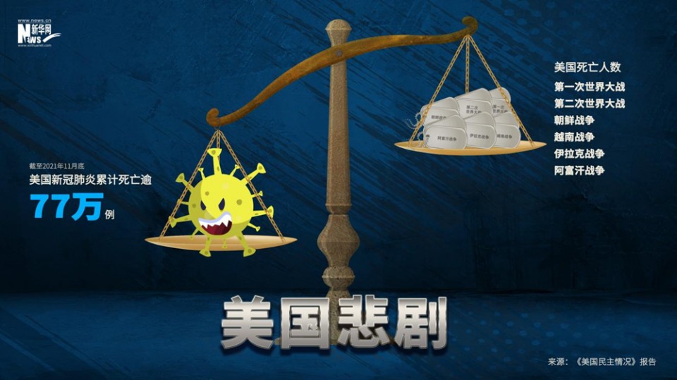 首页 创意漫画|美国悲剧 2021-12-07 11:35:32 分享 外交部网站12月5日发布《美国民主情况》报告,梳理美国民主制度的弊端,分析美国国内民主实践的乱象和对外输出民主的危害。报告指出,美国号称具有世界上最丰富的医疗资源,应对新冠肺炎疫情却一片混乱,成为世界上确诊人数和死亡人数最多的国家。截至2021年11月底,美国累计报告新冠肺炎确诊病例超过4800万例,累计死亡逾77万例,死亡人数已超越1919年大流感病亡人数,也超过美在一战、二战、朝鲜战争、越南战争、伊拉克战争、阿富汗战争死亡人数之和。