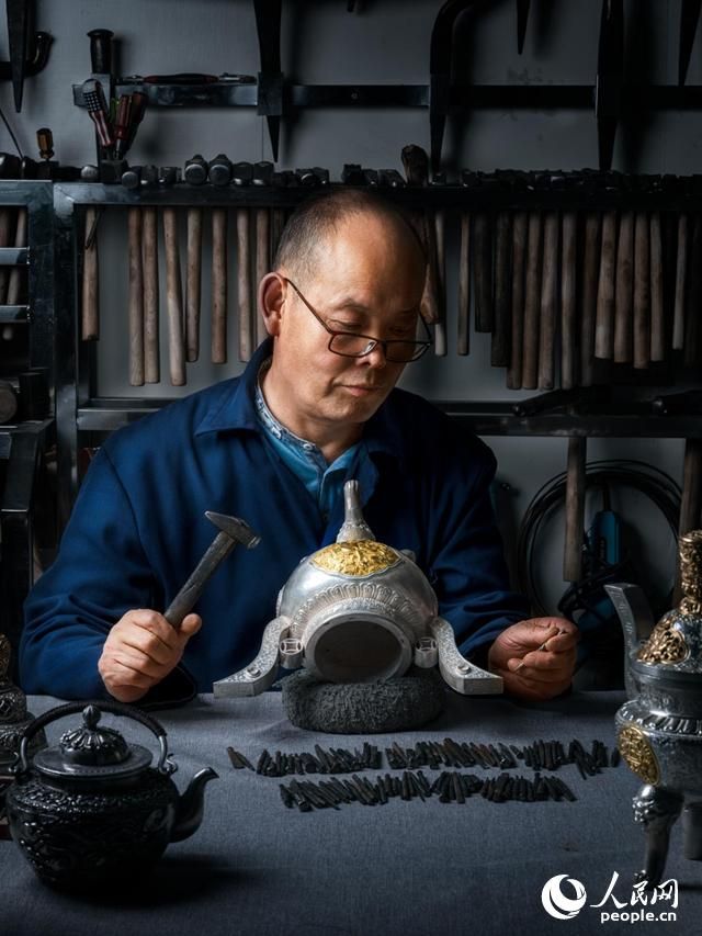 国家级非物质文化遗产,湟中银铜器制作与鎏金技艺代表性传承人何满。人民网 雷阳摄