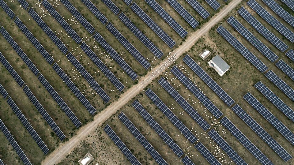 羊群在青海省海南藏族自治州共和光伏产业园吃草(2019年6月16日摄,无人机照片)。新华社记者 吴刚 摄
