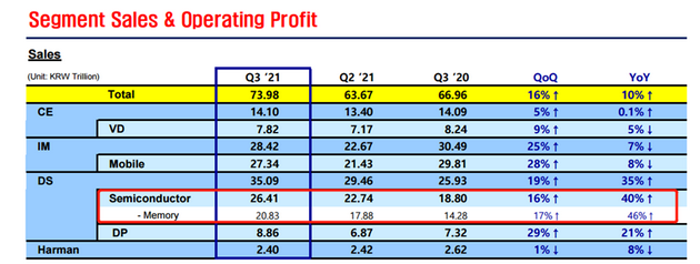 在设备解决方案中,半导体业务是主要的贡献者,第三季度营收达到26.41万亿韩元,同比增长40%。