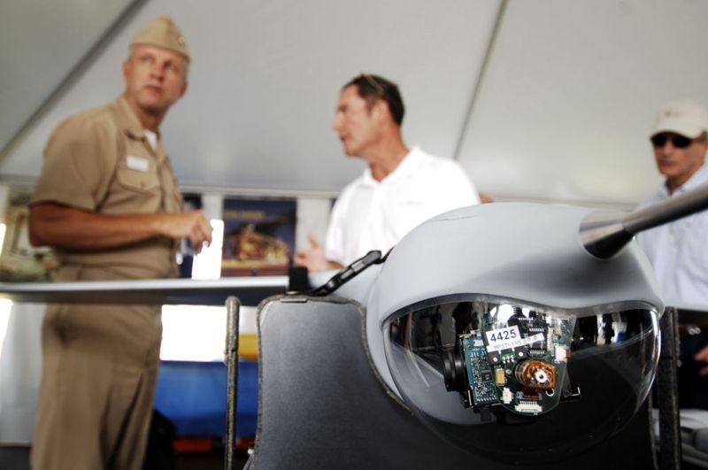 2007年8月6日,在美国马里兰州帕图克森特河海军航空站,波音公司展出其研制的可携带红外摄像机的无人驾驶飞行器SCAN-EAGLE。新华社记者张岩摄
