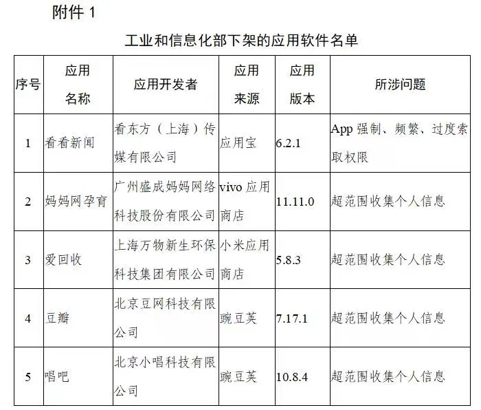 根据工信部公布的信息显示,截至目前,尚有 5 款 APP 未按工信部要求完成整改,其中包括豆瓣、唱吧,这两款APP所涉问题均为超范围收集个人信息。同时,各通信管理局积极开展 APP 技术检测,截至目前尚有 101 款 APP 仍未完成整改。