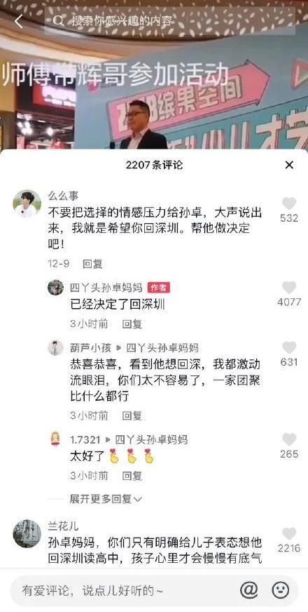 近日,孙卓妈妈彭四英也在社交平台称,孙卓决定回深圳。