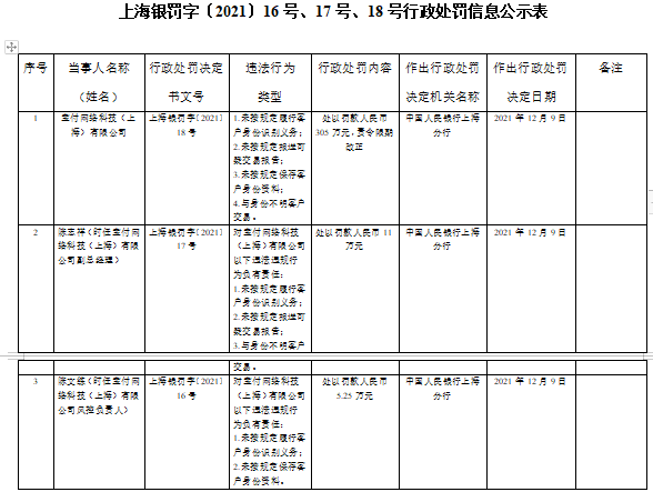 中国科技新闻网12月13日讯(李欣)12月13日,中国人民银行上海分行网站公布了行政处罚信息公示表(2021年第216期),宝付网络科技(上海)有限公司(以下简称“宝付支付”)被中国人民银行上海分行处以罚款人民币305万元。