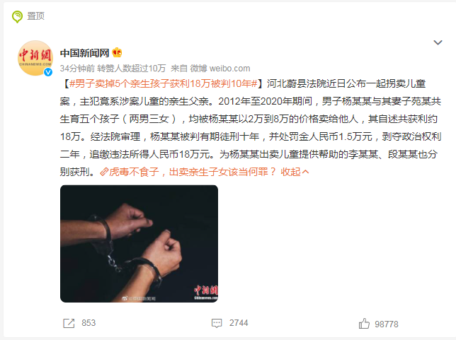 据中国新闻网报道,河北蔚县法院近日公布一起拐卖儿童案,主犯竟系涉案儿童的亲生父亲。2012年至2020年期间,男子杨某某与其妻子苑某共生育五个孩子(两男三女),均被杨某某以2万到8万的价格卖给他人,其自述共获利约18万。