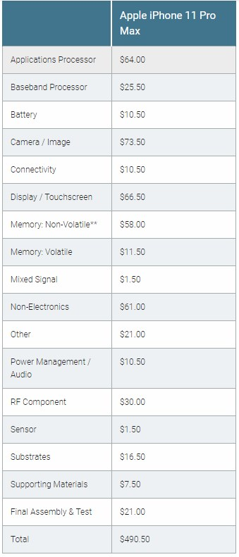 根据分析,iPhone 11 Pro Max(512GB版本)的BOM物料成本为490.5美元(四舍五入精确到0.5美元),约合人民币3493元,为其国行版定价12699元的27.5%。需要指出的是,物料成本指的是各个元件的成本,没有算上研发之类的成本。