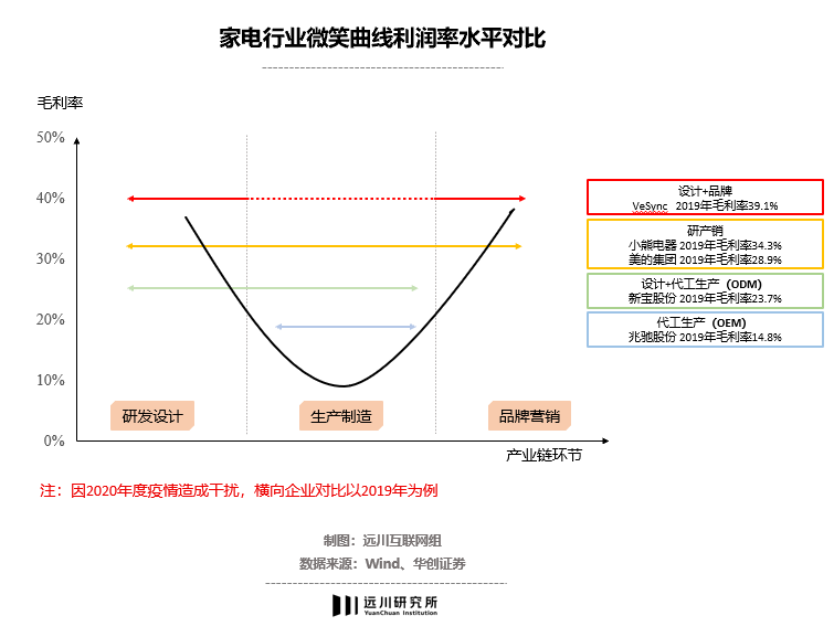根据华创证券对VesSnc、美的、新宝和兆驰股份这些不同产业链环节的家电企业测算,按利润率从高到低的环节排序是:设计+品牌>研产销一体>设计+代工(ODM模式)>纯代工(OEM模式)。