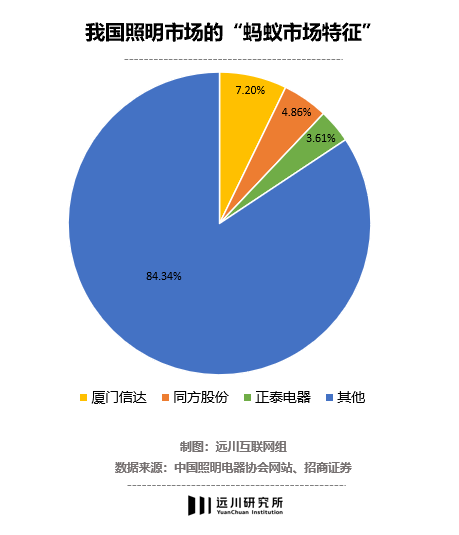 以国内照明行业为例,2016年行业总营收达到5600亿元级别,但前三家最大照明上市企业收入占比只有15.67%,其余84.34%市场由中小企业占据,是一个典型的蚂蚁市场。