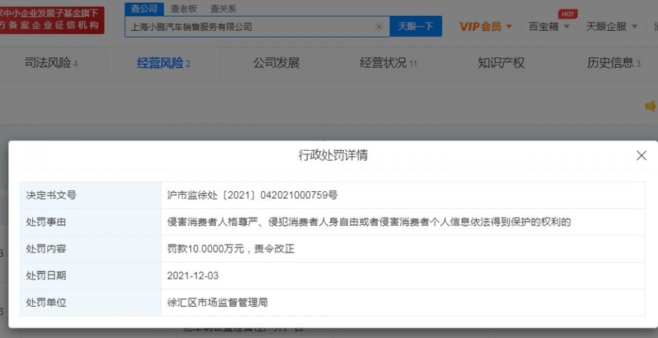 12月14日,据天眼查APP显示,造车新势力小鹏汽车因线下门店擅自采集43万张消费者的人脸照片被罚款10万元。
