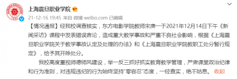 经我校调查核实,东方电影学院教师宋庚一于2021年12月14日下午《新闻采访》课程中发表错误言论,造成重大教学事故和严重不良社会影响,根据《上海震旦职业学院关于教学事故认定及处理的办法》和《上海震旦职业学院教职工处分暂行规定》,给予其开除处分。