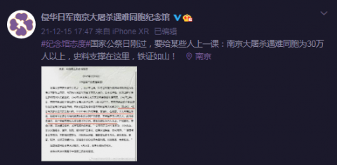 12月15日下午,@侵华日军南京大屠杀遇难同胞纪念馆 发文回应:国家公祭日刚过,要给某些人上一课:南京大屠杀遇难同胞为30万人以上,史料支撑在这里,铁证如山!