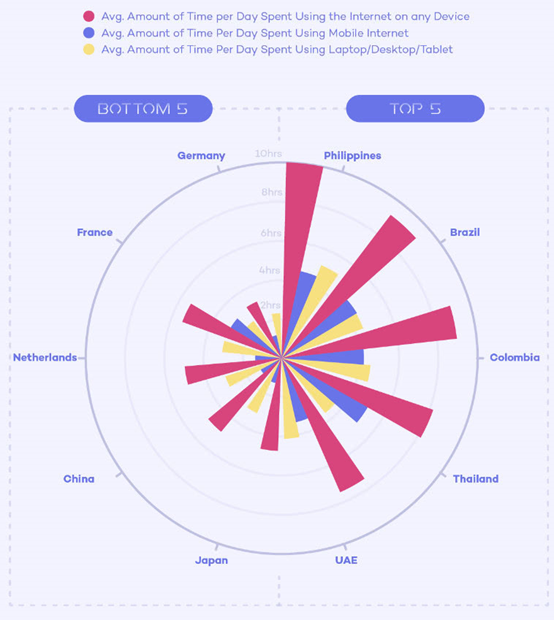这项研究称,菲律宾是世界上网时间最多的国家,每天上网时间高达10个小时,其次是巴西、哥伦比亚和泰国(它们每天在互联网上的时间都超过9个小时)。