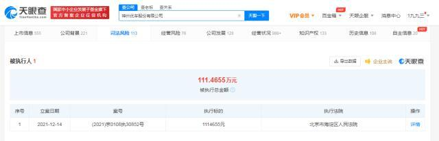 炣燃科技12月17日讯(李莉)天眼查App显示,近日,神州优车股份有限公司新增被执行人信息,执行标的1114655元,执行法院为北京市海淀区人民法院,关联案件为合同纠纷。