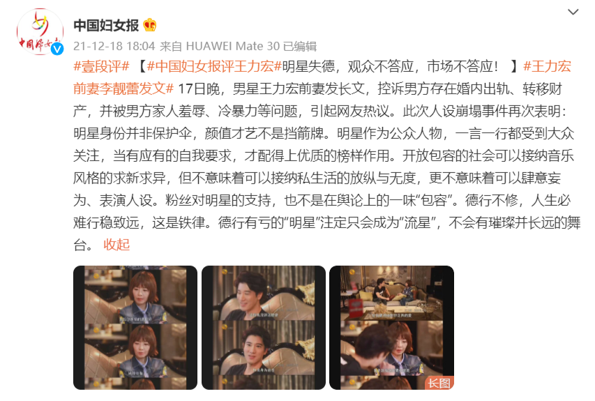 12月17日,王力宏被前妻李靓蕾发文控诉,12月18日,@中国妇女报 评论表示此次人设崩塌事件再次表明:明星身份并非保护伞,颜值才艺不是挡箭牌。德行有亏的“明星”注定只会成为“流星”。