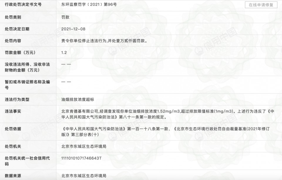原创内容 北京肯德基因油烟排放浓度超标被处罚 2021-12-20 16:31:06 分享 炣燃科技12月20日讯(李莉)12月20日,根据天眼查信息显示,北京肯德基有限公司近日新增一则行政处罚信息,因其油烟排放浓度1.52mg/m3超过排放限值标准(1mg/m3),违反了《中华人民共和国大气污染防治法》第八十一条第一款的规定,被北京市东城区生态环境局罚款1.2万元,并责令停止违法行为。值得注意的是,本次并非北京肯德基第一次因环保问题被罚。“信用中国”网站信息显示,2021年5月20日,北京肯德基因非甲烷总烃排放浓度超标6倍以上被北京市东城区生态环境局处以行政罚款3万元。