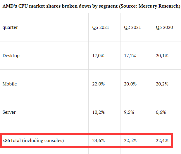 在英特尔跟随西方政客炒作新疆议题之际,其市场份额也正被竞争对手AMD侵蚀。市场调研机构Mercury Research的数据显示,2021年第三季度,AMD在X86 CPU市场上的整体份额环比增加了2.1个百分点,达到24.6%,这是AMD历史上第二高的纪录,15年前该公司曾创下最高纪录25.3%。