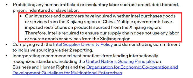 这封信发布于今年12月,是英特尔对供应商的最新要求:禁止任何形式的贩卖人口或非自愿劳工行为,如强迫劳动、债务劳工、契约劳工或奴役。