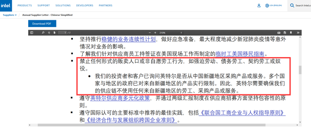 12月21日,观察者网查询英特尔官网发现,在该公司以简体中文、繁体中文、英语、日语等多种语言向供应商写的一封信中,有一句话特别扎眼:
