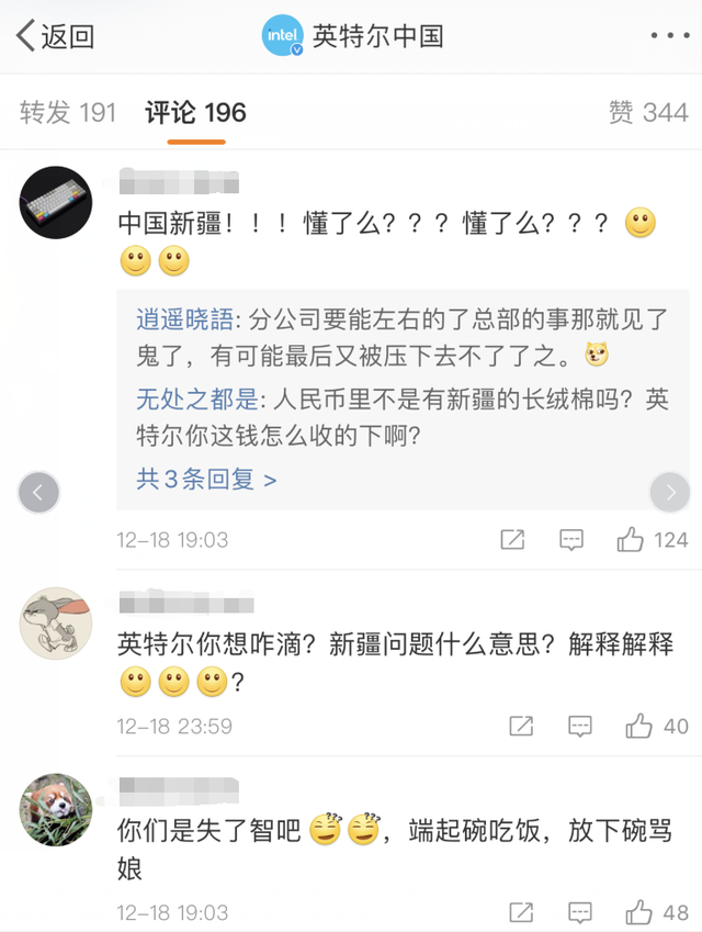 在英特尔禁用新疆产品的消息传出后,中国网友纷纷涌入英特尔官方微博账号下方质问该公司: