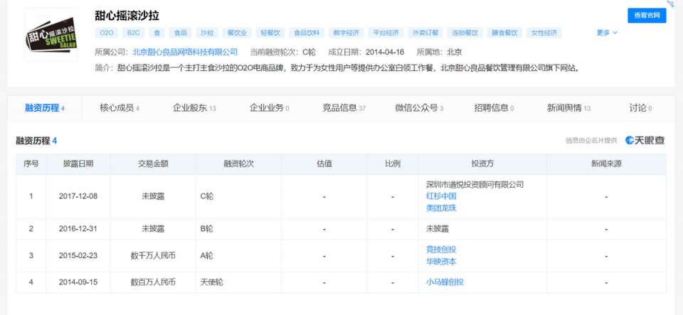 据悉,2016年,米有沙拉曾获真格基金的800万元的天使轮融资;2015年,甜心摇滚沙拉获得华映资本在内的A轮融资,其后两年分别完成了B轮、C轮融资,融资金额接近亿元。据公开数据统计,在2015年至2018年期间,至少有10亿资本涌入轻食市场。