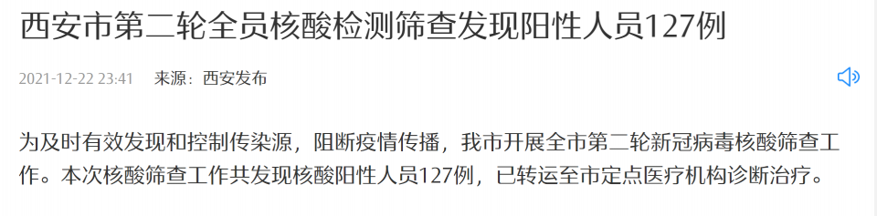 首页 西安市第二轮全员核酸检测筛查发现阳性人员127例 2021-12-23 09:38:38 分享 据西安市疫情防控指挥部消息,为及时有效发现和控制传染源,阻断疫情传播,西安市开展全市第二轮新冠病毒核酸筛查工作。本次核酸筛查工作共发现核酸阳性人员127例,已转运至市定点医疗机构诊断治疗。来源:央视新闻