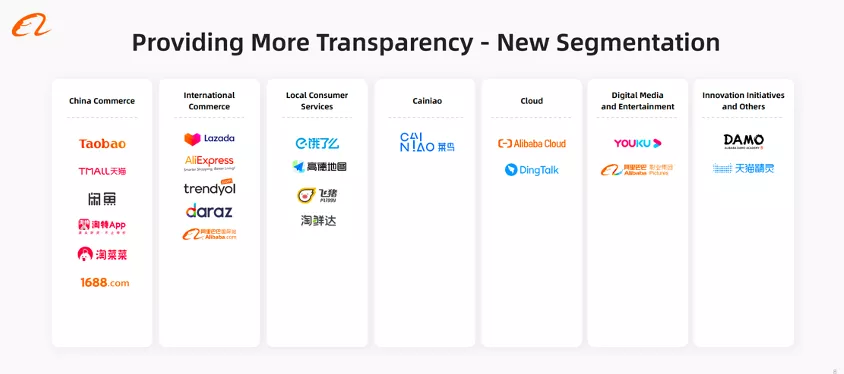 从集团的高度看,阿里巴巴的板块治理的思路有更直接的呈现。本次投资者日,阿里巴巴集团首席财务官武卫表示,阿里巴巴将商业分部进一步拆分为“中国商业”、“跨境及全球商业”、“本地生活服务”、“菜鸟”四个部分,进一步提升公司透明度,反映业务最新进展。
