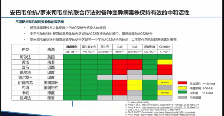腾盛博药高级副总裁、生物制药部门负责人朱青博士介绍,美国国立卫生研究院(NIH)最新的公开数据总结显示,罗米司韦单抗是所有单克隆抗体中少有的中和活性不受奥密克戎影响的抗体,且全球多个实验室的评估结果一致。因此,安巴韦单抗/罗米司韦单抗联合疗法对奥密克戎保持了良好的中和活性,较其他抗体产品优势明显。