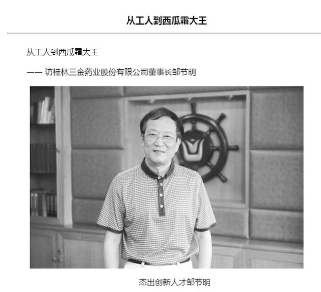 作为桂林三金创业史的灵魂人物,邹节明被誉为“西瓜霜大王”。