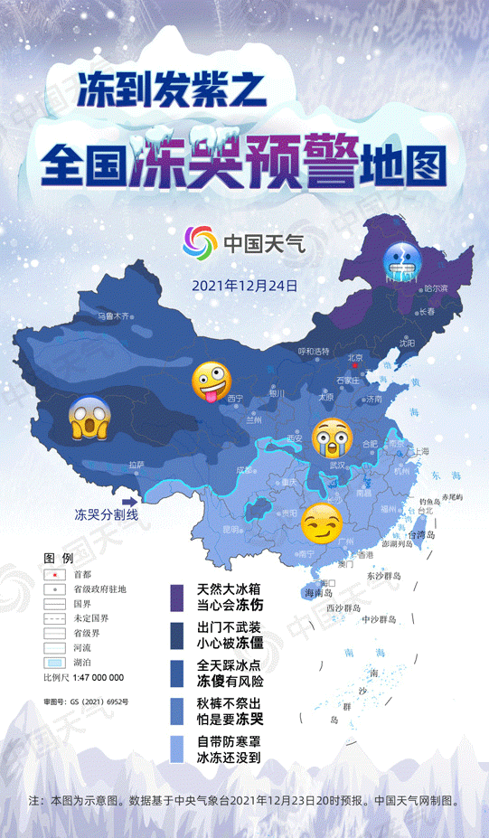 从中国天气网推出全国冻哭预警地图上可以看出,随着寒潮南下,冻哭线也不断南压,24日位于长江中下游一线,25日南压到湖南南部、贵州南部一线,26日将压至华南北部一带,届时我国八成国土都将被冻透。