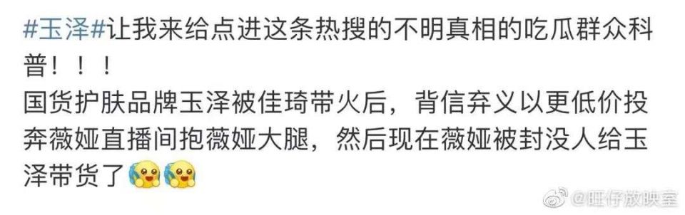 有网友表示,玉泽在被李佳琦带火之后,“背信弃义”以更低价投奔薇娅,现在薇娅被封没人给它带货了。