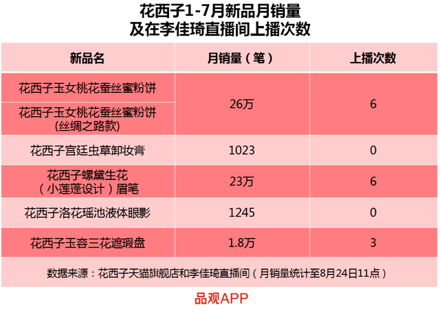 同样是李佳琦带货的品牌花西子,一度让业界认为品牌是在给李佳琦“打工”,品观app数据显示,在花西子2020年上半年发布的6款新品中,有两款登上李佳琦直播间6次,月销量达到20多万笔;没有上播的,月销量仅在1000笔左右。当品牌过度依赖某位主播成长时,很容易受到一人之力的影响。