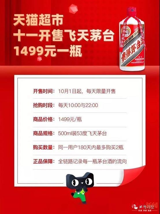 同时,天猫平台也于10月1日正式开售飞天茅台酒。