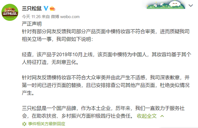 12月26日中午,针对 有部分网友反馈三只松鼠部分产品页面中模特妆容不符合审美,进而质疑该公司相关立场一事,@三只松鼠 发布声明称,页面中模特为中国人,其妆容均基于其个人特征打造,无刻意丑化。对网友反馈模特妆容不符合大众审美并由此产生不适感,深表歉意,并第一时间已 进行页面的替换,且已安排排查公司其他产品页面,杜绝类似情况产生。