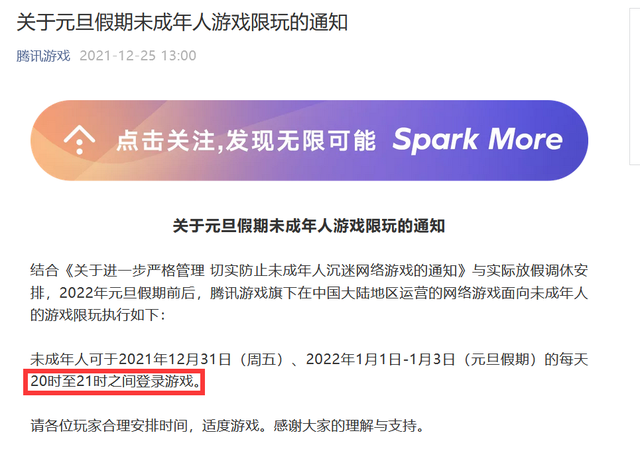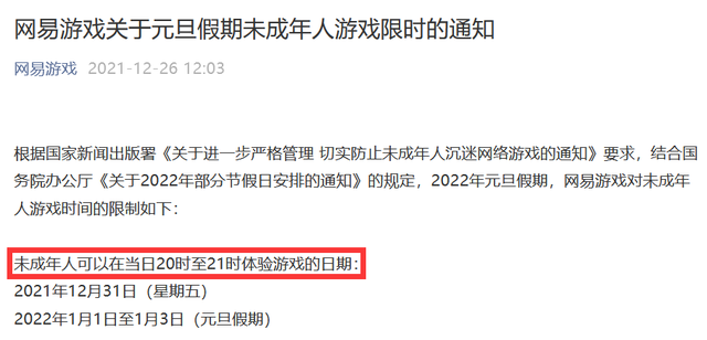 原创内容 腾讯、网易发布通知 未成年人元旦假期每日限玩1小时 2021-12-27 13:11:14 分享 炣燃科技12月27日讯(李莉)12月25日、26日,腾讯游戏和网易游戏相继发布公告称,2022年元旦假期前后,未成年人可于2021年12月31日(周五)、2022年1月1日-1月3日(元旦假期)的每天20时至21时之间登录游戏。