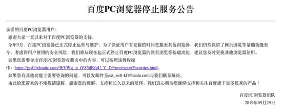 9月30日,百度浏览器在官网发布“百度PC浏览器停止服务公告”,正式宣布停止服务。公告称,现在起正式停止百度PC浏览器的网页浏览等基础功能,建议用户及时更换其他浏览器使用。