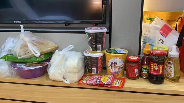 27日上午9点多,小李和妈妈去了酒店附近一家超市,发现桶面都卖光了。她们买了点饼、六七个馒头,另外还买了几桶酸辣粉和辣酱。