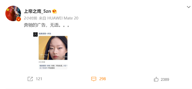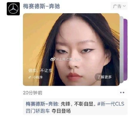 质疑奔驰广告“故意的”还有微博账号@马上评 ,他在微博上称:我们不是批评模特的长相,而是批评这种刻意“高级脸”的吊稍妆容,批评这种刻意迎合西方对东亚人的刻板定义!所以说,奔驰你给模特化这种妆不是有病?这几天雄狮少年到三只松鼠闹得这么凶,我不信奔驰不是故意的!