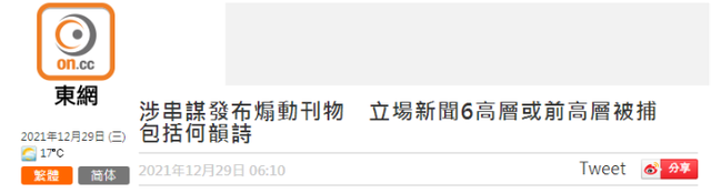 “东网”称,据了解,被拘捕6人为何韵诗、钟化权、周达智、吴霭仪、方敏生、林绍桐,当中5人为前董事,其余1人为署理总编辑,涉嫌提供平台发布煽动性文章,违反《刑事罪行条例》第9及10条串谋煽动意图罪。