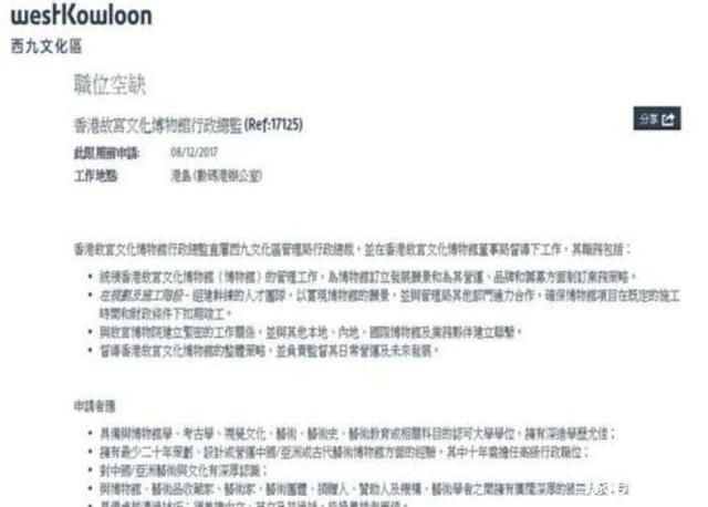 图为招聘故宫馆行政总监要求申请者“擅长普通话”(西九文化区管理局网页)